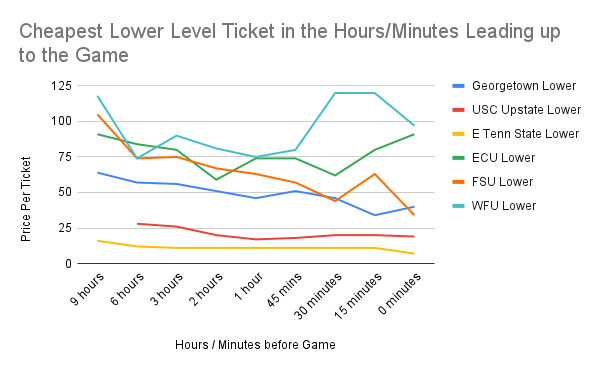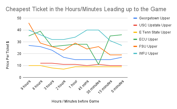 The Six Hour Golden Window: In every tested scenario, the best ticket price was available on the day of the game, usually between six hours before the game, up until the actual tipoff. As a rule of thumb, prices generally stayed flat until about 72 hours out, and then began to slide downwards. For example, the cheapest ticket to the Wake Forest game decreased from $92 (three days before the game) to $27 at tipoff, a potential savings of 71%! However, the downward slide isn’t linear, and prices can actually spike in the last 60 minutes leading up to the game (particularly for bigger conference games). For that reason, I’d recommend checking ticket prices at regular intervals on game day, and pulling the trigger when you see a standout value.