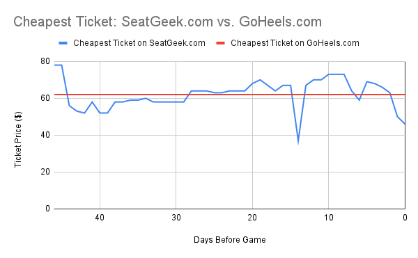 If you do want to plan ahead, and are fine with upper level tickets, consider buying directly from the university at GoHeels.com. In this example from the FSU game, GoHeels.com was often cheaper, but it’s worth checking both sites.
